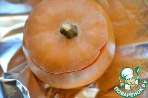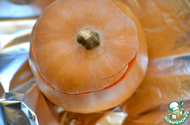 Завернуть тыкву в фольгу и поставить на 1,5 часа в духовку. Запекать при температуре 180 -200 градусов. В мультиварке режим "выпечка" 60 минут.