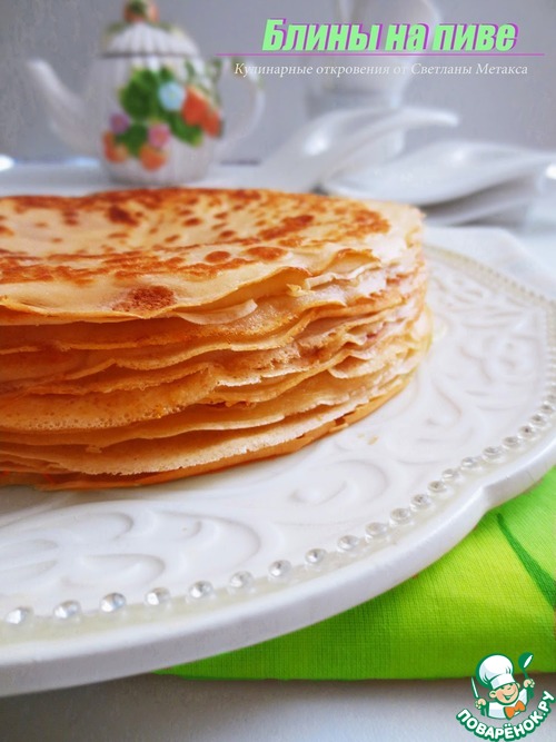 По старинной традиции во время Маслениц нужно печь блины и наслаждаться прекрасным их вкусом. Говорят, что масленичный блин символизирует солнце и чем больше блинов съешь, тем будет больше солнца в твоей жизни... Какие только блины не пекут люди. Это и классические блины на молоке, кефире, это и блины на газированной воде, шоколадные, цветные блины. Нельзя обойти стороной и блины, приготовленные на пиве. Пиво может быть какое угодно, светлое и темное, и безалкогольное. Наличие пива в блинах совершенно не чувствуется, но вкус получается замечательный! Уверена, многие знакомы с этим рецептом, но я все же решила поделиться своим исполнением. Всех с Масленицей!!!