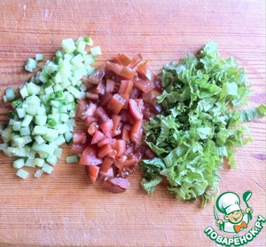 • Салат тонко нарезать. Помидор и огурец нарезать кубиками.