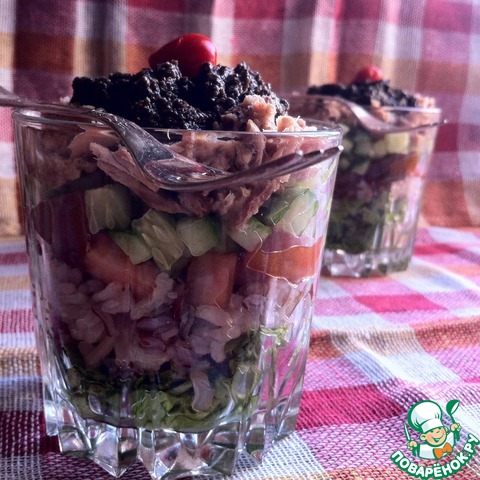 • Выкладываем в порционные стаканы салат, рис, помидор, огурец и тунец. Сверху выкладываем тапенад.