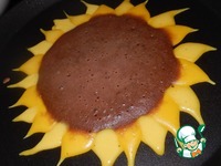 Выпекаем все блинчики, для последнего уменя осталось мало шоколадного и много желтого теста поэтому цветочек выглядел немного подругому. Подаем блины с соусом.