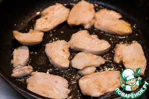 Вареное куриное филе нарезать на кусочки и быстро обжарить на сильном огне, буквально до появления золотистого цвета.
