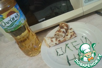 • Стаканчики переворачиваем вверх дном и смазываем подсолнечным маслом Олейна. Одеваем на донышко сначала обычный блинчик, затем шоколадный.