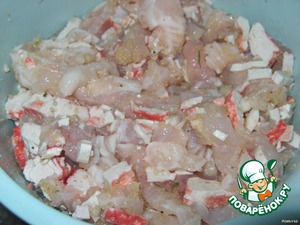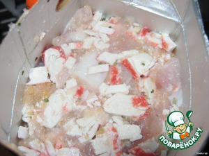 Смешать рыбу, крабовые палочки, специи, сухой желатин.