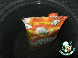 У пакета отрезать верх, промыть. Сложить в него фарш.