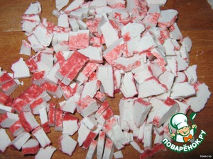 Крабовые палочки нарезать.