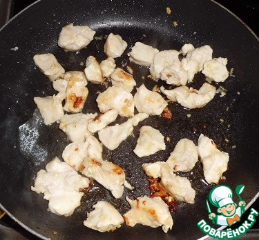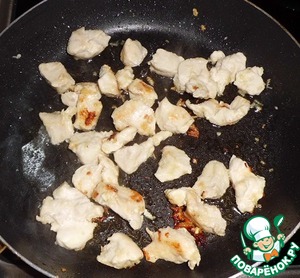 Мелко нарезаем куриную грудку, добавляем чеснок (натертый на мелкой терке) и хорошо обжариваем на растительном масле, до золотистой корочки.