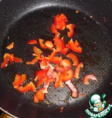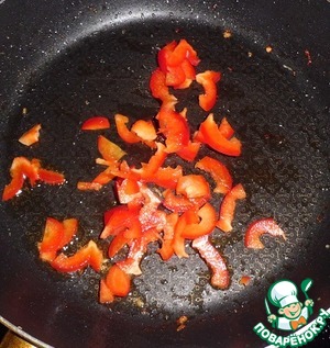 Забираем со сковороды курицу и отправляем туда мелко нарезанный болгарский перец (минуты на 2-3)