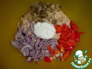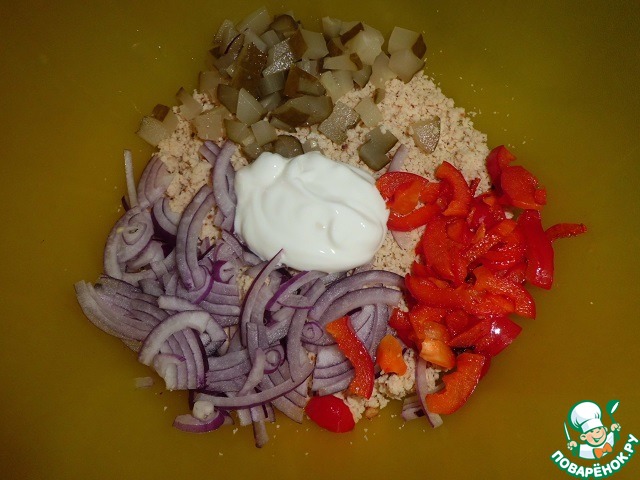 Куриное филе отправляем в комбайн, максимально измельчаем. Перекладываем в отдельную емкость. Добавляем нарезанный лук, болгарский перец, мелко нарезанный огурец и сметану, перемешиваем. -