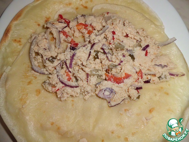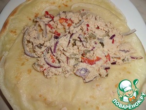 На половинку готового блина, выкладываем начинку и накрываем второй. Складываем в треугольник (хотите сверните в рулеты, это не принципиально)) -