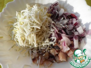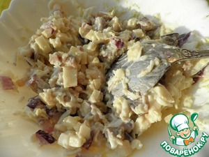 Филе сельди, яйца, мякоть яблока, лук мелко порубить.
