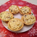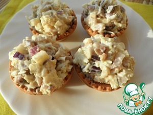 Все ингредиенты сложить в одну тарелку, заправить майонезом и тщательно перемешать. Это и будет начинка для тарталеток.