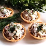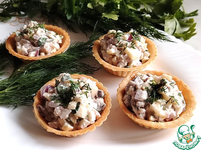 Теперь заполним ей тарталетки, посыпем измельчённой зеленью укропа.