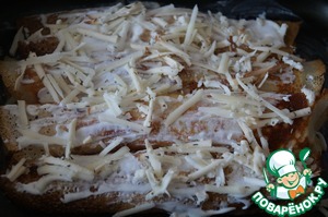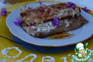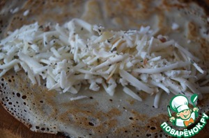 Блины кладем на смазанный сливочным маслом противень, смазываем слегка сметаной и сверху посыпаем немного сыром