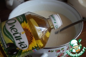 Смешать молоко, ряженку, яйца, сахар, соль и муку, все хорошо взбить миксером, затем добавить растительное масло Олейна и