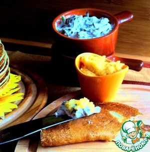 Очень нежные, тонкие блинчики с дипом из рикотты и щавеля. Особенно вкусно с подкопченной икрой мойвы.