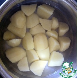 Картофель очистить, разрезать на несколько частей. Залить водой так, чтобы она едва покрывала картофель. Варить до мягкости.