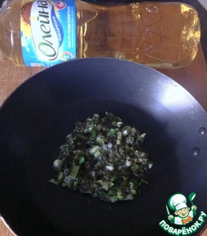 Спассеровать пару минут лук на подсолнечном масле Олейна. Добавить щавель и через минуту снять с огня. Смешать с рикоттой, посолить и поперчить по вкусу.
