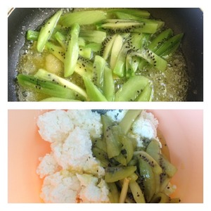 Киви очистить, нарезать соломкой и потушить с сахаром и маслом на среднем огне, почти до полного испарения жидкости. Киви должны быть мягкими, но не разваливаться в кашу.