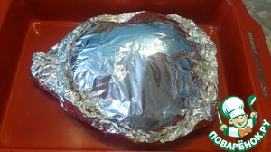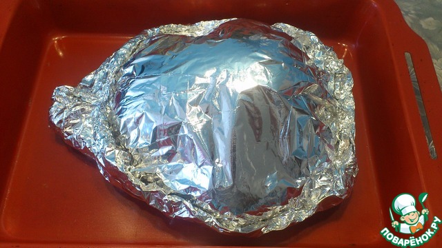 Курицу завернуть в фольгу и запекать в духовке около 1,5-2 часов. За 30 минут до готовности раскрыть фольгу и запечь до румяной корочки.