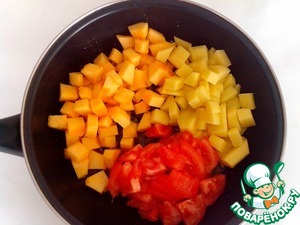 Помидоры вымыть, сделать на каждом крестообразный надрез, выложить в кипяток на 15-20 секунд, затем переложить в холодную воду. С охлажденных помидоров снять кожицу и нарезать дольками, картофель и кабачки – кусочками. Добавить овощи к луку и жарить все вместе 10–15 минут.