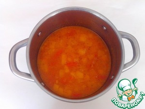 Овощи переложить в кастрюлю, влить горячий овощной бульон, посолить по вкусу и варить до готовности овощей (5-10 минут).