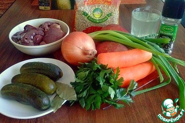 Ингредиенты для «Рассольник с куриной печенью и перловкой»: