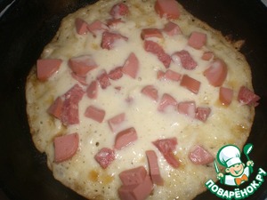Замесить тесто для толстых блинов, по консистенции как на оладьи. Наливать тесто на сковороду небольшого диаметра. Через пару минут насыпать на тесто припек - мелко нарезанные колбасные изделия.