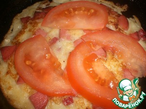 Перевернуть блин обратно, разложить сверху помидоры и посыпать тертым сыром