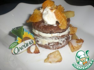 Мороженое между слоями шоколадных блинчиков - вкусный десерт. А фрукты фламбе, выложенные на него, делают блинное пирожное изысканным и романтичным.