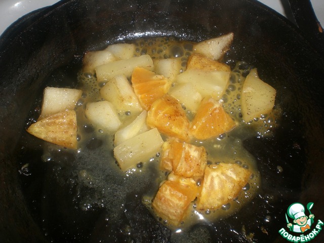 • Фрукты очистить, порезать. На сковороде растопить сливочное масло, добавить сахар и потушить фрукты. Влить ложку коньяка и осторожно поджечь спичкой. Фрукты фламбе готовы.