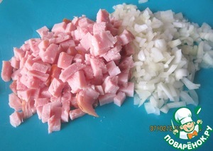 Лук очистить и порубить. Бекон нарезать мелкими кубиками и нагреть в глубокой сковороде, пока из него не вытопится жир. Добавить топленое масло и обжарить рубленный лук до полупрозрачности, затем убавить огонь и обжаривать еще 5 минут.