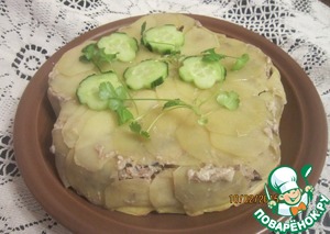 На днях приготовила. Очень понравилось. Запекала в керамической форме диаметром 27 см (11") и высотой бортика 5,5 см. Именно для такой формы картошки я взяла 4 шт ( примерно по 200 гр каждая). Лук - 2 штуки как по рецепту. Форму смазала маслом и посыпала хлебной крошкой. А потом стала выкладывать ломтики картошки. Борта сделала двойные ( т е 2 слоя картошки) Как раз ломтики были по высоте формы. Рис брала какой был. Права при варке добавила масла сливочного. А консерва у меня была собственного приготовления ( рецепт взят здесь же) из селедки с добавлением масла. Риса ( обыкновенный) правда взяла больше нормы. ( 1 стакан сухого).