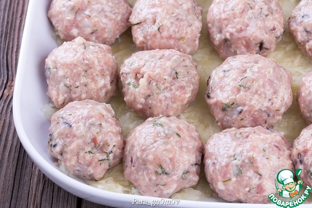 5. На дно формы выложить яблочно-луковую смесь ровным слоем. Влажными руками сформировать "ежики" и выложить на смесь. Запечь при температуре 190 градусов около 10 минут, чтобы они схватились.