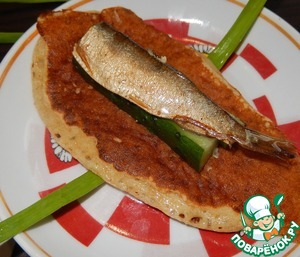 • Даем оладьям остыть и хорошенько пропитаться чесночным маслом. Огурец моем и нарезаем соломкой. Под оладушек подкладываем перо зеленого лука. На оладушек выкладываем огурчик. Затем сверху шпроту. Подвязываем луком, выкладываем на блюдо и подаем.