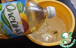 • Когда наша опара поднялась. Добавляем в нее кефир, яйца соль. Хорошо взбиваем, вводим всю оставшуюся муку. Тесто получается довольно густым, вливаем подсолнечное масло. Оставляем тесто на час- полтора подняться.