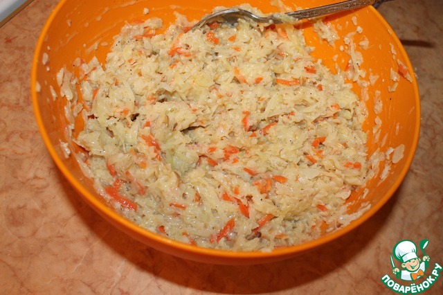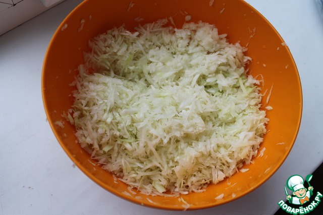 На терке трем капусту. Я знаю, что можно в комбайне или блендере, но не пробовала. Тушим ее не на сковороде, минут 10, по необходимости добавляем водичку, буквально чуть-чуть, чтобы не пригорала капуста.