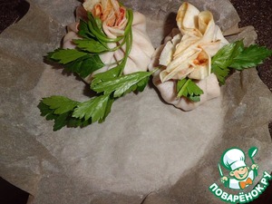 ... формируем мешочки. Скрепляем веточкой петрушки (возможно зубочисткой).