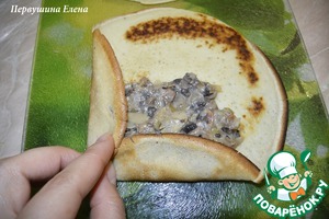 Теперь нужно завернуть начинку в каждый блин. Кладем начинку на половину блина, оставляя свободными края по бокам, примерно на 1см. А внизу 2 см
