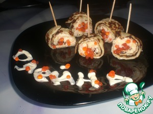 Свернуть блинчик рулетом, разрезать поперек на маленькие рулетики и вставить зубочистку - получатся канапе