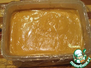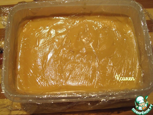 Постепенно вольём молоко с крахмалом в карамельную смесь, помешивая. Дальше я сделала так-довела смесь до кипения, протёрла её через сито и поставила на водяную баню уваривать до нужной мне густоты. Затем крем охлаждаем, помешивая (можно поставить кастрюлю с кремом в кастрюлю с ледяной водой для ускорения процесса). Перекладываем крем в контейнер, на поверхность крема положим плёнку и уберём в холод до полного остывания и застывания.