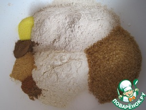Для пряничных оладьев: смешаем два вида муки, пряности (кроме ванили), соль, сахар и цедру ( я взяла апельсиновый сахар). В отдельной посуде растопим сливочное масло, слегка охладим, смешаем с молоком, ванильным сахаром и желтками.