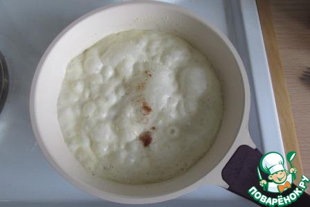 Обжариваем на смеси сливочного и подсолнечного масел до легкой румяности. Всыпаем столовую ложку муки и жарим ещё около 1 минуты, помешивая. Вливаем молоко, добавляем чуть соли, помешивая, готовим минут 7 до загустения.