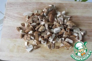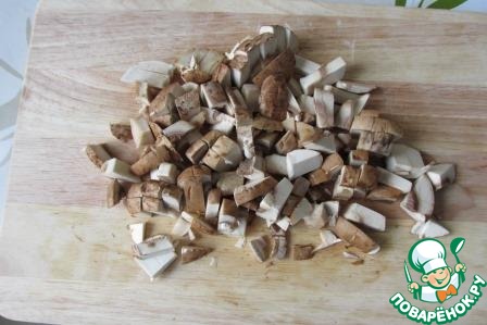 Как только в грибах испарится вся влага, добавляем ветчину и 3 столовых ложки соуса.