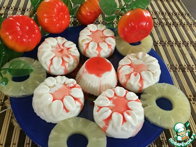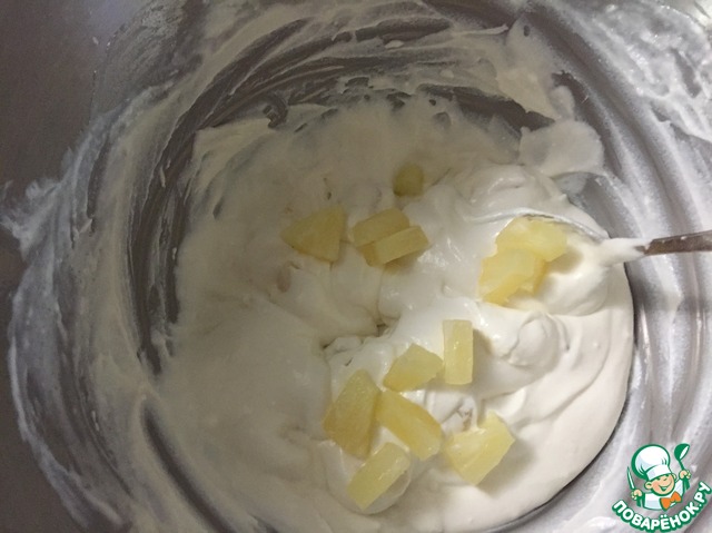 Добавить порезанные ананасы. Молоко с желатином подогреть ( не доводить до кипения) постоянно помешивая. Ввести в творожную массу, аккуратно помешивая