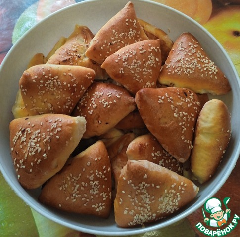 И присыпать кунжутом. Выпекать пироги в заранее разогретой духовке при 180 гр. С, 30 минут.