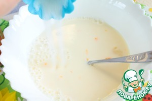 Яйцо куриное (2шт.) смешать с теплым молоком (2 стак.)