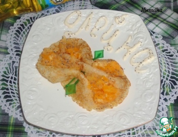 Начинка из карамелизованных яблок и свежих апельсинов придает блюду оригинальный и необычный вкус. А интересная формовка позволит разнообразить праздничный стол на Масленицу.