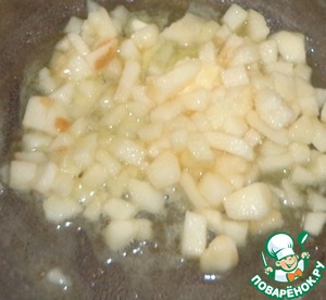 Яблоки очистить от кожицы, удалить сердцевину. Оставшуюся часть порезать кубиками. В толстостенной кастрюле растопить сливочное масло и высыпать в него яблоки. Кастрюлю накрываем крышкой и оставляем яблоки тушиться на медленном огне. Затем убираем крышку и увеличиваем огонь. Карамелизуем яблоки 2-3 минуты. Затем даем им остыть.