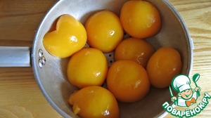 Тем временем, подготовим начинку для блинчиков. Персики достаем из сиропа и кладем на дуршлаг, чтобы ушла лишняя влага.